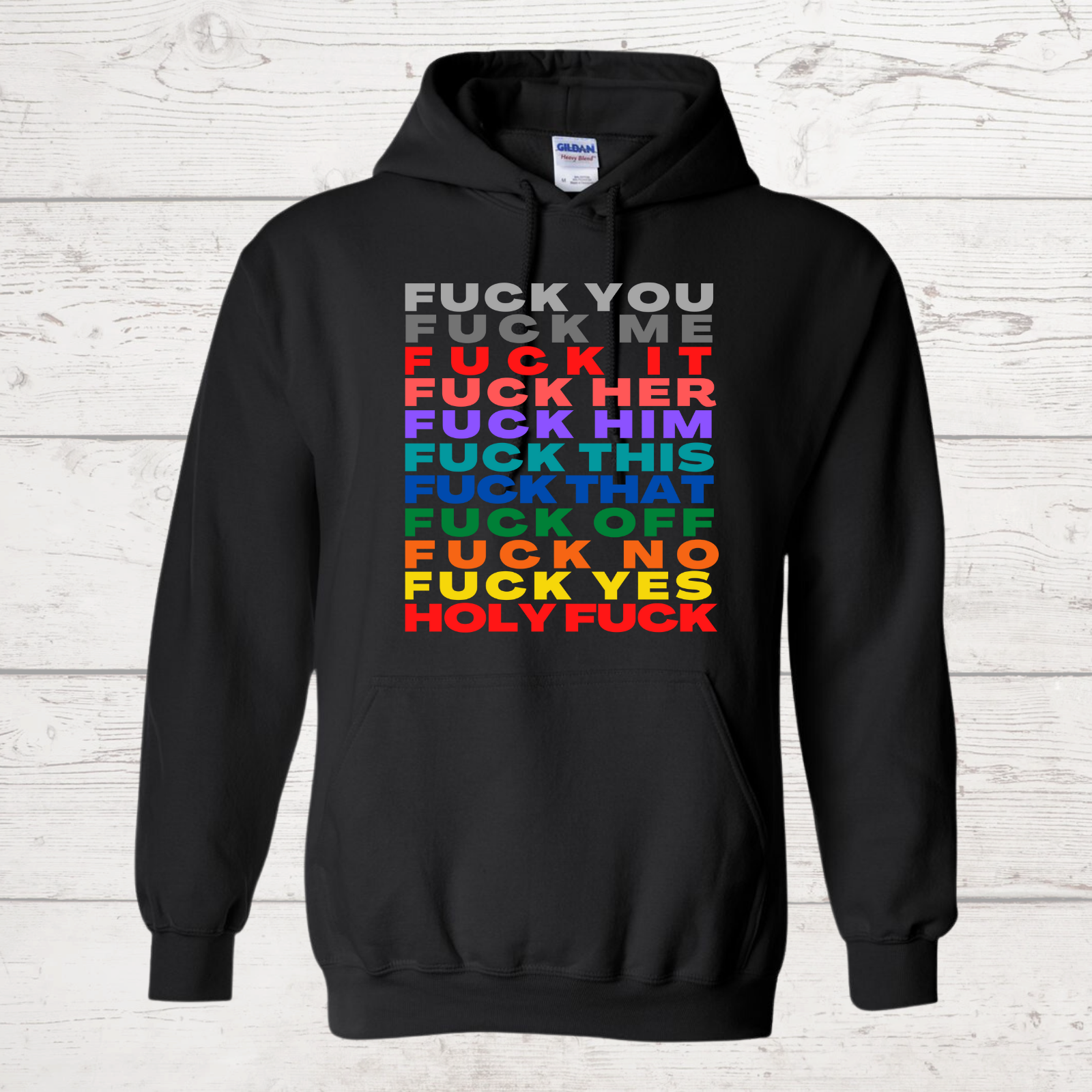 Let your shirt do the talking with our Fuck You, Me, It, Her, Him Etc. hoodie. Perfect for when you want to tell someone off without saying a word. Snarky and funny, this sweater speaks volumes (without actually speaking).
