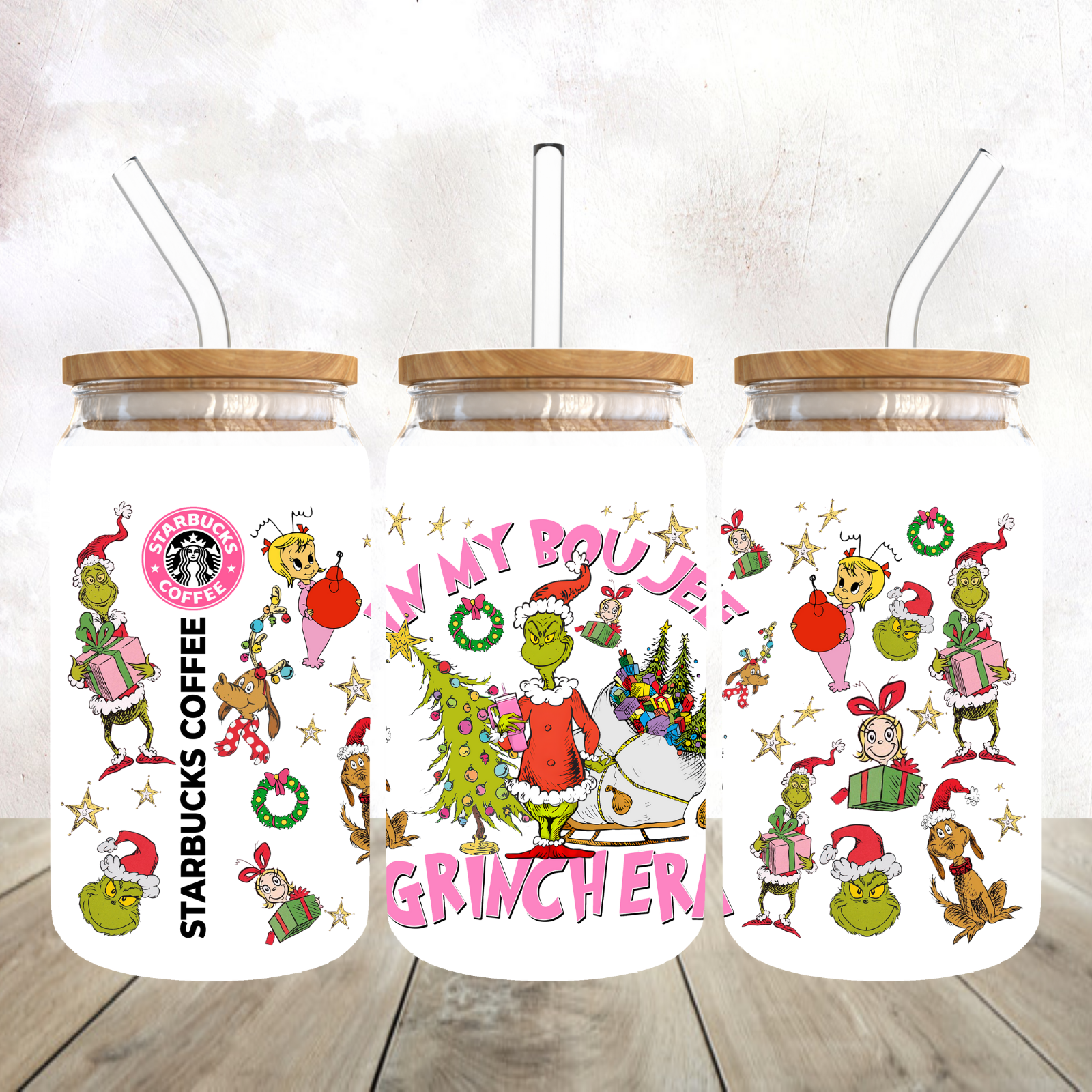Mean Green Guy Starbies Grincy and Boujee 16oz frosted glass libby tumbler - Comes with bamboo lid and straw. Enjoy your iced coffee or favourite cold drink in this awesome libby tumbler