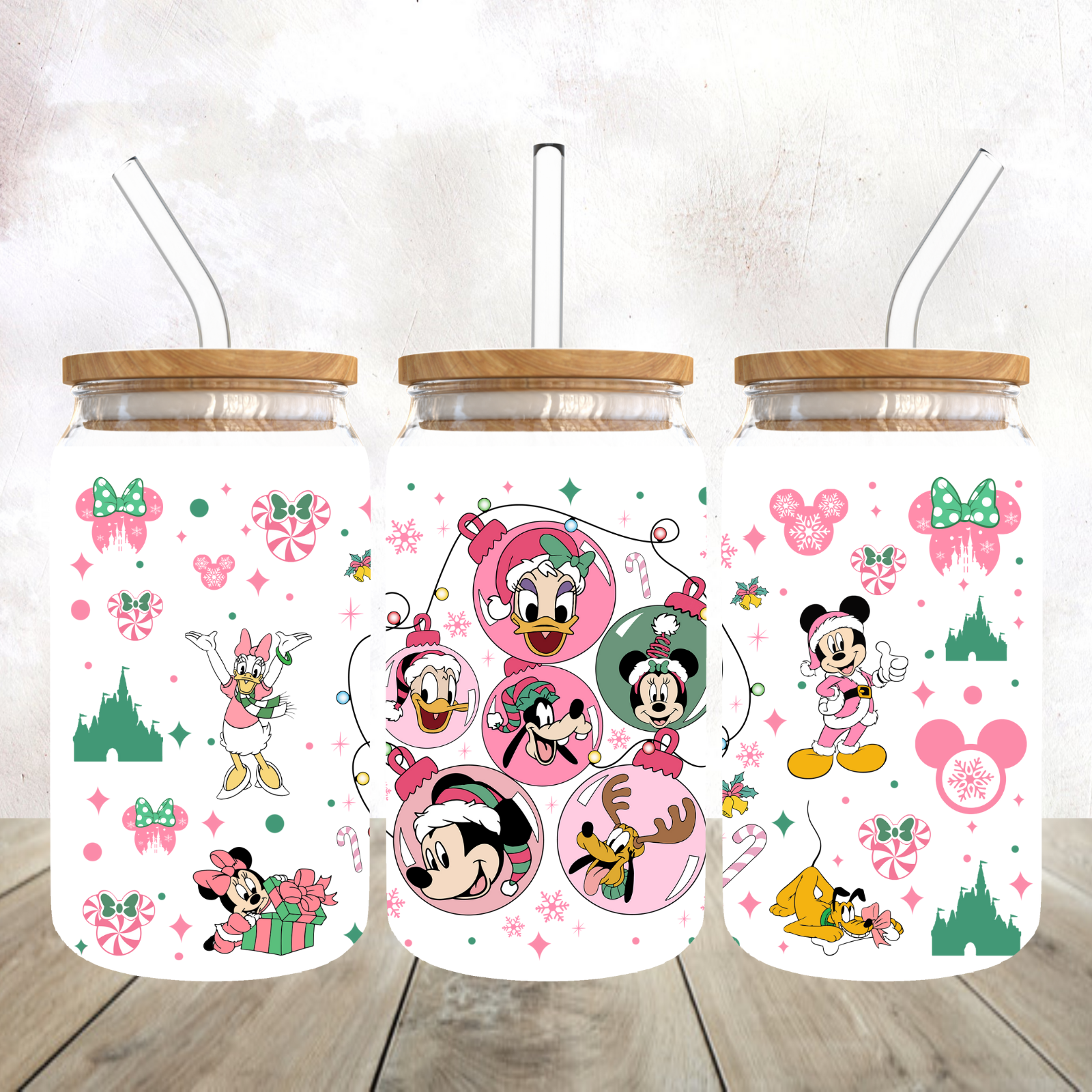 Pink Mickey and Friends Christmas bulbs 16oz frosted glass libby tumbler - Comes with bamboo lid and straw. Enjoy your iced coffee or favourite cold drink in this awesome libby tumbler