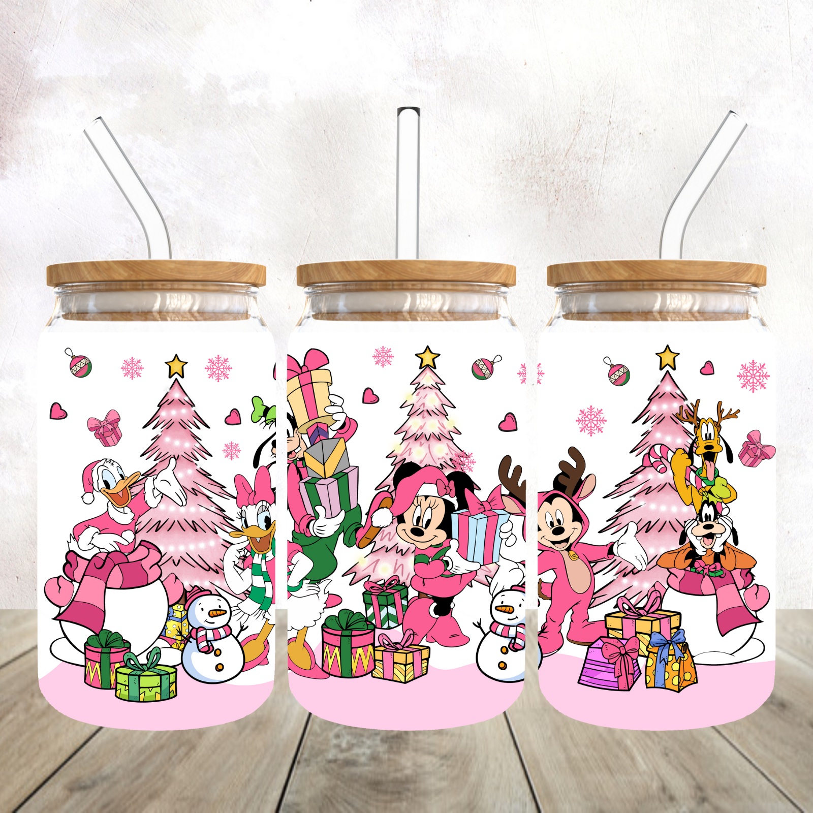 Pink Mickey and Friends Christmas Tree 16oz frosted glass libby tumbler - Comes with bamboo lid and straw. Enjoy your iced coffee or favourite cold drink in this awesome libby tumbler